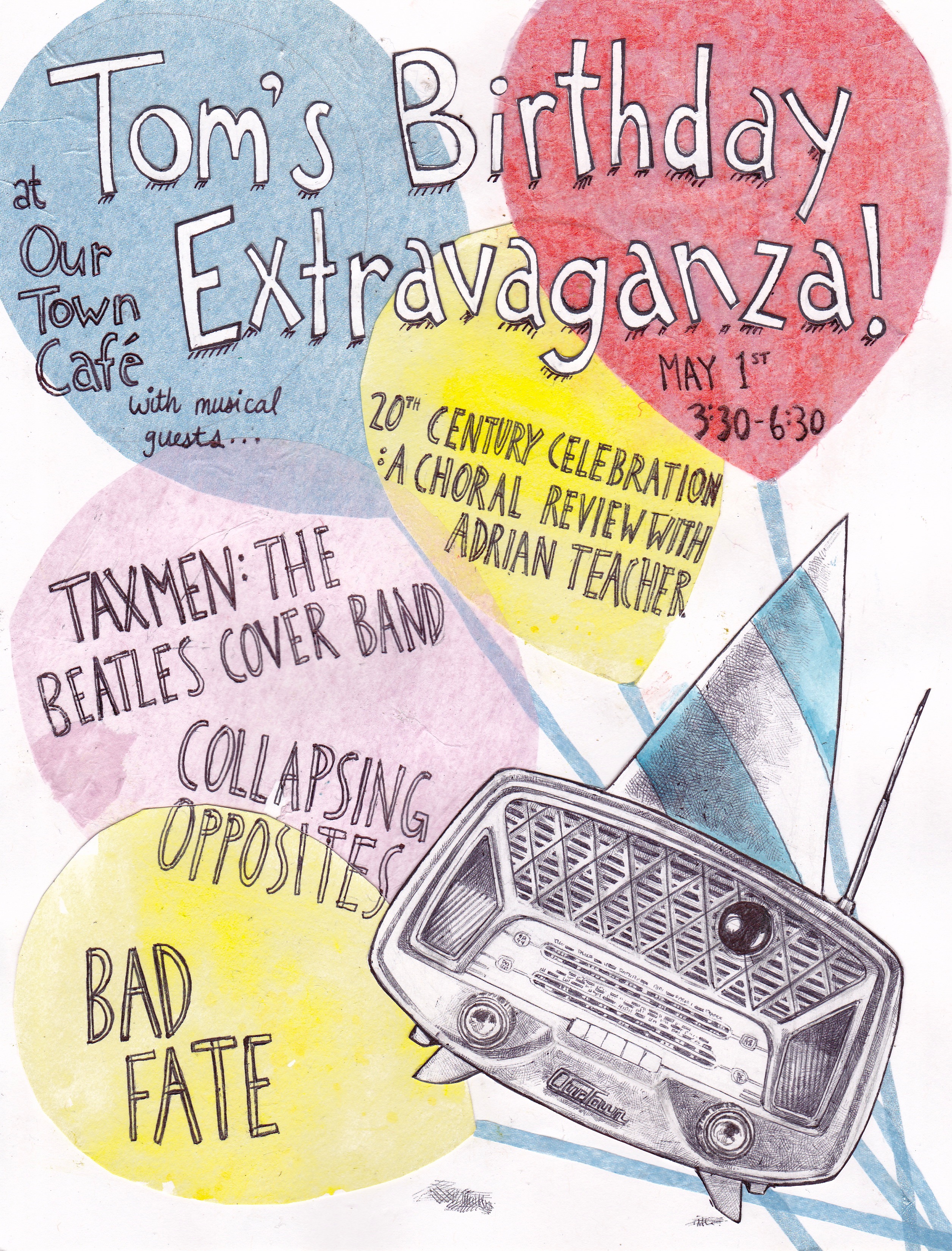 Tom is a rad guy whose birthday is coming up, and our mutual and also rad friend, Adrienne is hosting a show at Our Town. Here is the poster/invitation made up for this very special occasion. Bands are: