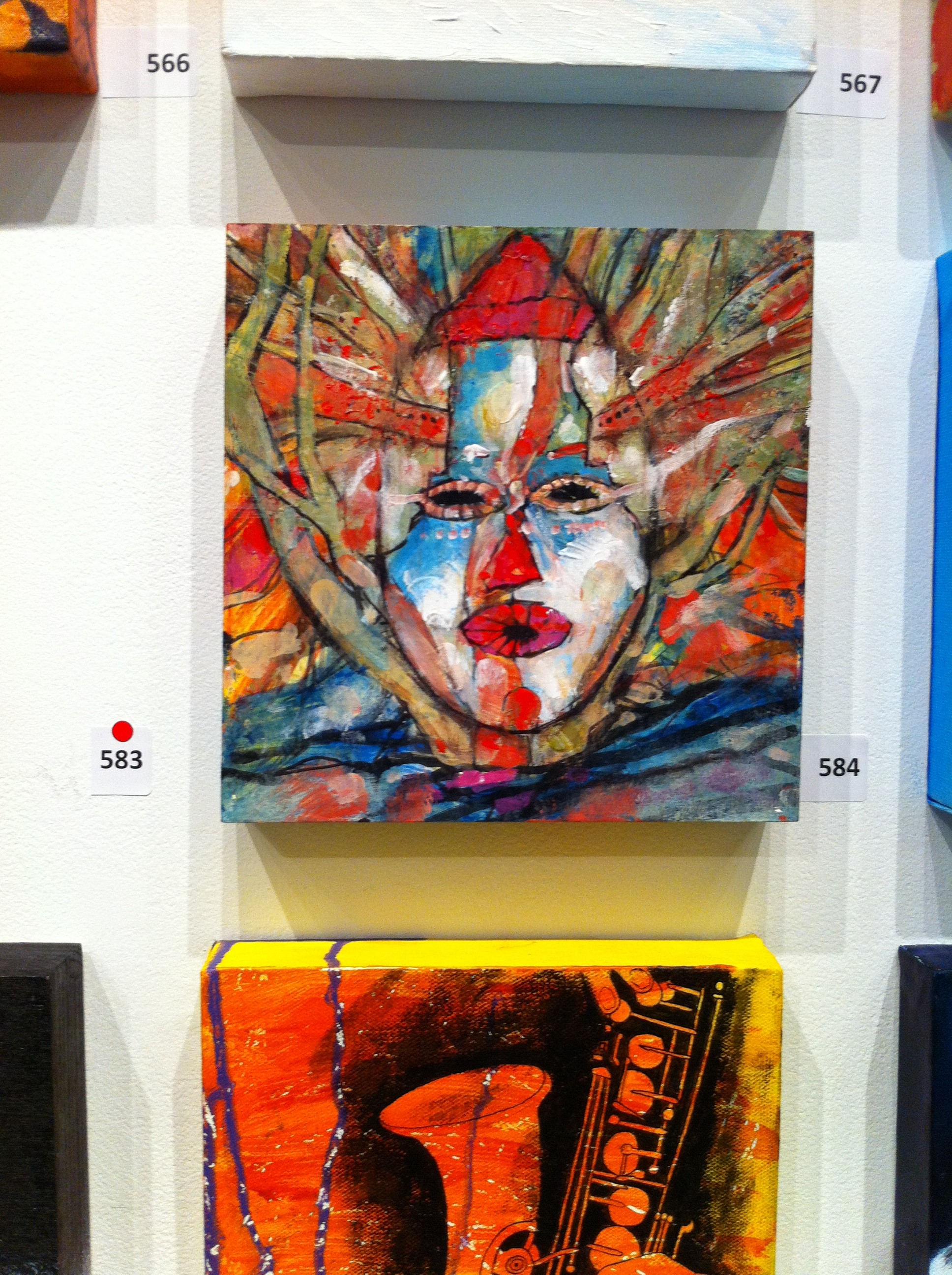 The past weekend until now has been busting full of artistic inspiration, partially provided by my cute, artsy parents.  I just got back from seeing some of their artwork in the  ‘anonymous show’ in North Van.  This show is a cool idea for a fundraiser (for the North Vancouver Arts Council maybe?) where people submit canvases that are all the same size (8 in x 8 in I think, some small size) and the selected works are all displayed anonymously and sold for $100, with half of the money going to the Arts Council.   Spoiler alert: I am going to show which pieces were made by my parents, because I’m proud of them and actually like the pieces.  I also took some photos of some other favourites.